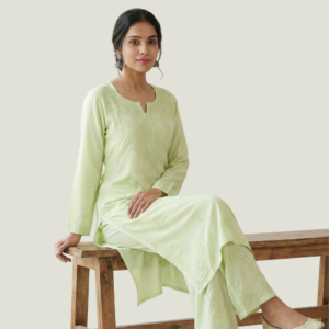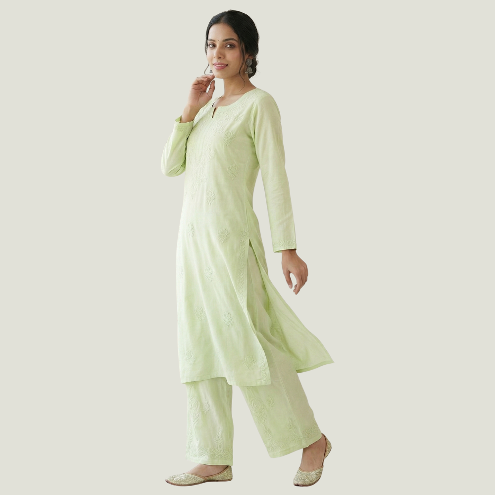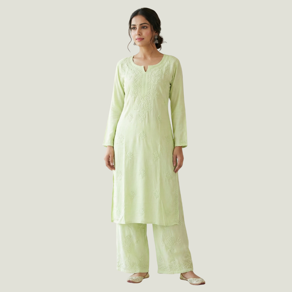 Rayon Kurta Set -Green Rayon Chikankari Kurta paired with matching embroidered pants, featuring delicate detailing for an elegant everyday look.