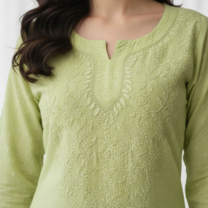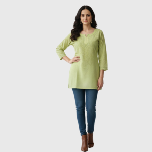 A blend of breathability and elegance. Dobby Cotton Short Kurti designed with a textured weave and accentuated by hand-embroidered Chikankari motifs, offering a stylish yet comfortable look for everyday wear.