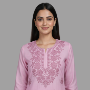 The kurta features intricate machine-embroidered motifs beautifully placed across the front, with a richly designed yoke that elevates its traditional charm. The straight-cut silhouette, three-quarter sleeves, and classic round neckline with a subtle slit create a look that is both timeless and flattering.