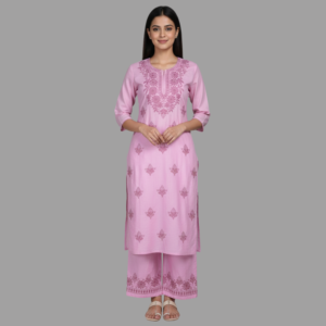Kushaali Rayon Co-ords featuring delicate machine-embroidered Chikankari motifs, paired with coordinated bottoms for a stylish and comfortable everyday look.
