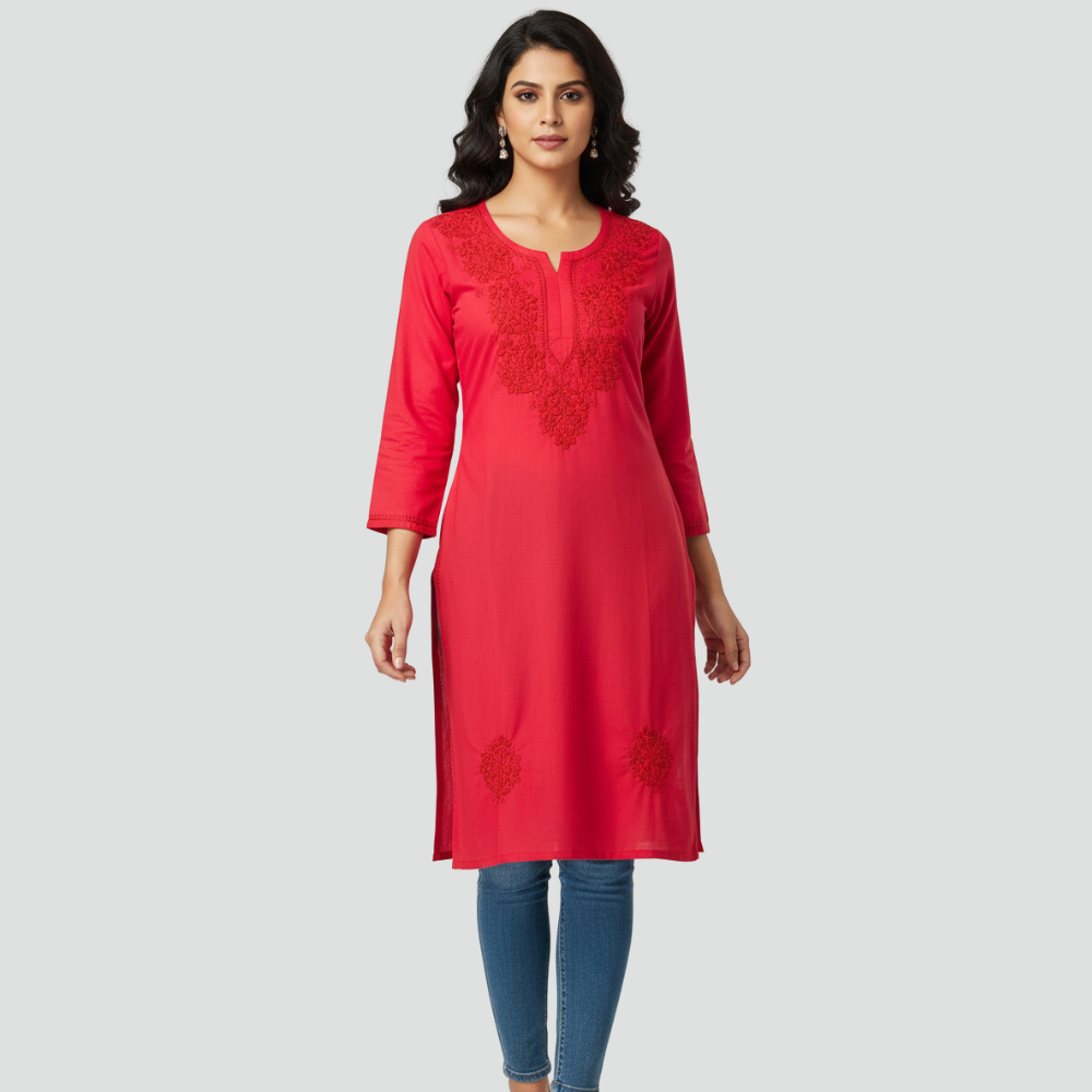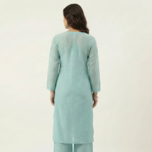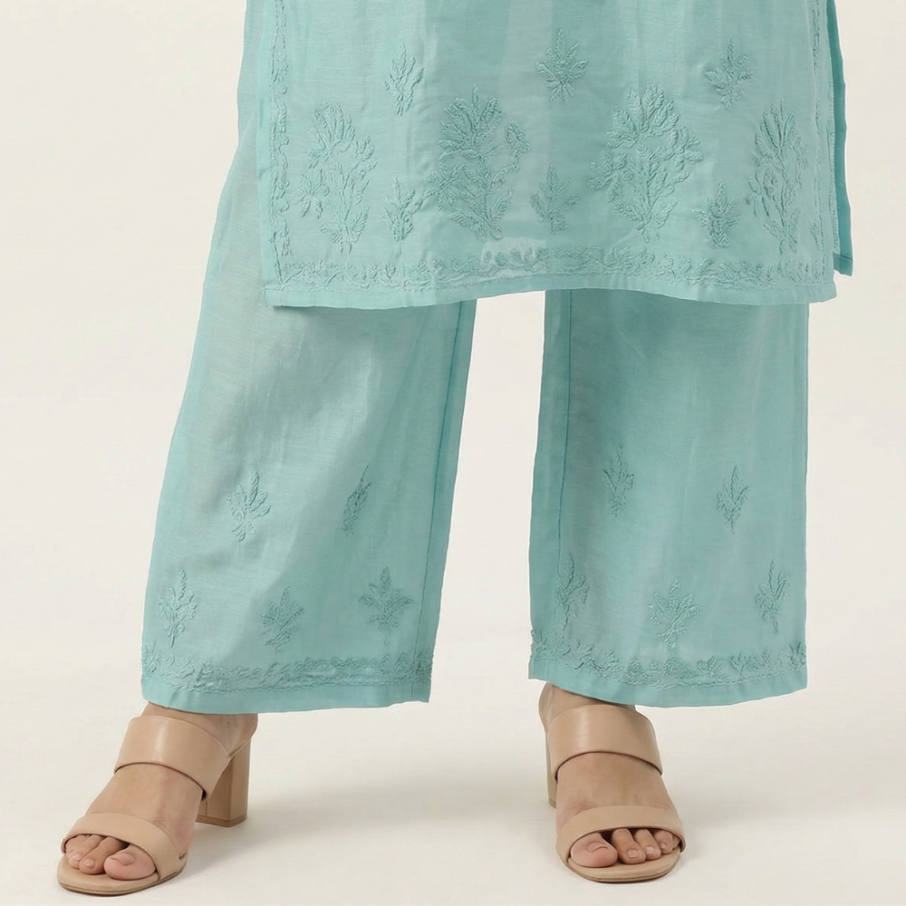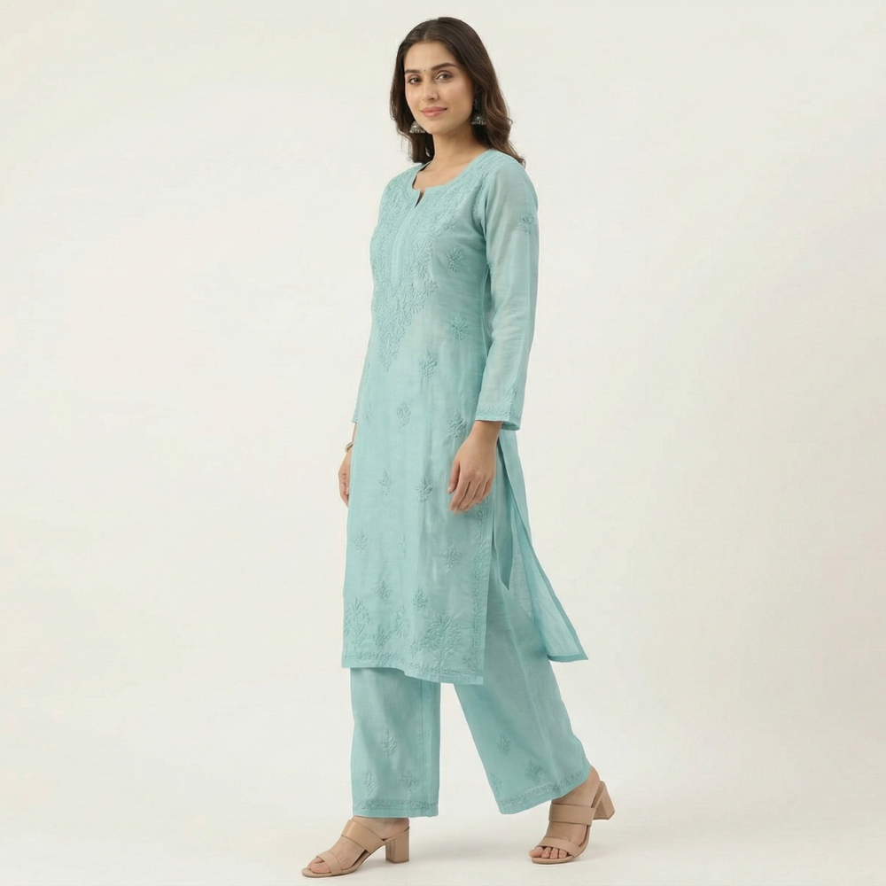 Elevate your everyday elegance with this soothing powder blue Chikankari kurta set, crafted for comfort and timeless appeal. The straight-cut kurta features delicate hand-embroidered Chikankari motifs across the yoke and hem, creating a refined yet understated look. Paired with matching wide-leg pants adorned with subtle embroidery, this set offers an effortless balance of tradition and modern ease. Made in breathable fabric, it’s perfect for long days, casual gatherings, or relaxed festive moments.