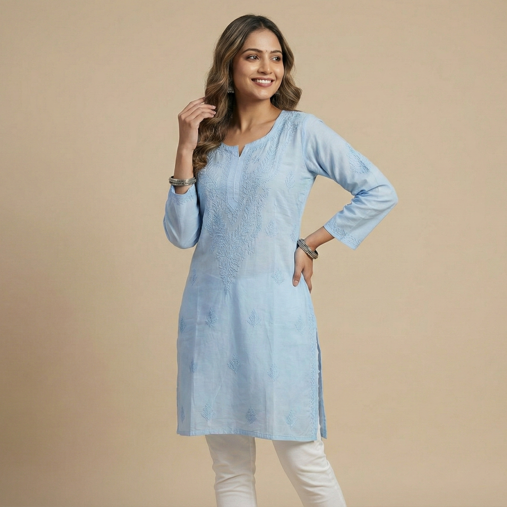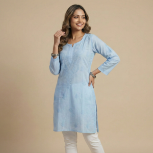 Mehek Chanderi Short Chikankari Kurti adorned with fine hand embroidery and a subtle sheen, offering a stylish and versatile look perfect for both casual and festive occasions.