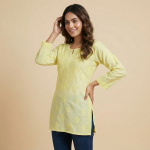 Mehek Chanderi Short Chikankari Kurti adorned with fine hand embroidery and a subtle sheen, offering a stylish and versatile look perfect for both casual and festive occasions.