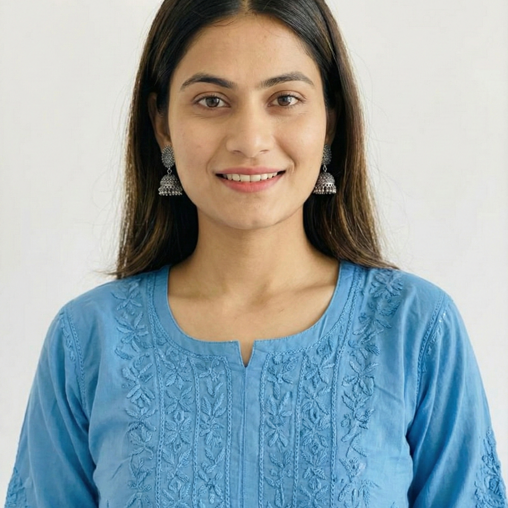 Pair this elegant white Chikankari kurta with ivory or pastel palazzos and delicate silver jhumkas for a refined daytime look. For a festive touch, add a soft pastel dupatta and embroidered juttis to highlight the graceful Lucknowi aesthetic.