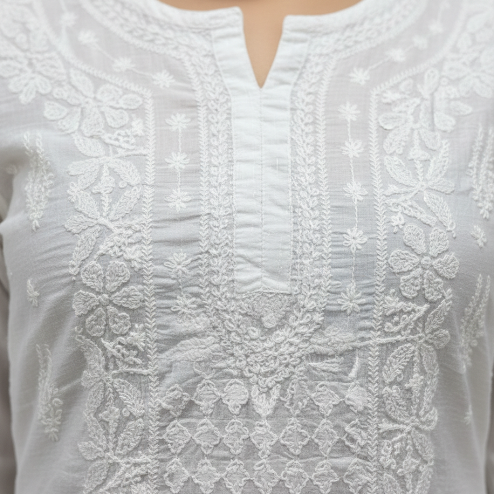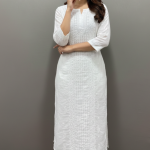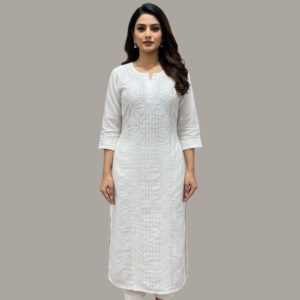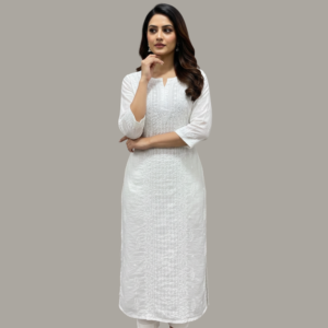 Graceful, timeless, and effortlessly elegant – this white Chikankari straight kurta celebrates the delicate beauty of traditional Lucknowi craftsmanship. Handcrafted with intricate Chikankari embroidery, the kurta features finely detailed floral and geometric motifs that create a soft texture across the fabric while maintaining a minimal and refined look.