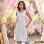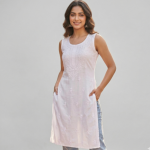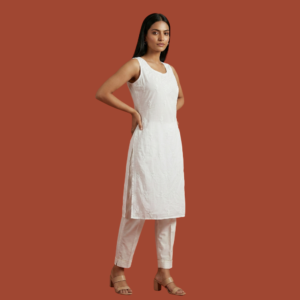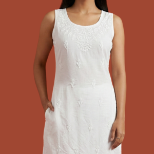 The Aira Sleeveless Muslin Kurti – White is a lightweight and elegant wardrobe essential, featuring delicate embroidery on soft muslin fabric for a refined and effortlessly graceful look.