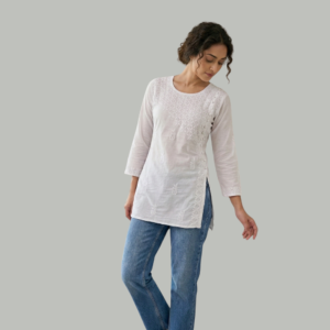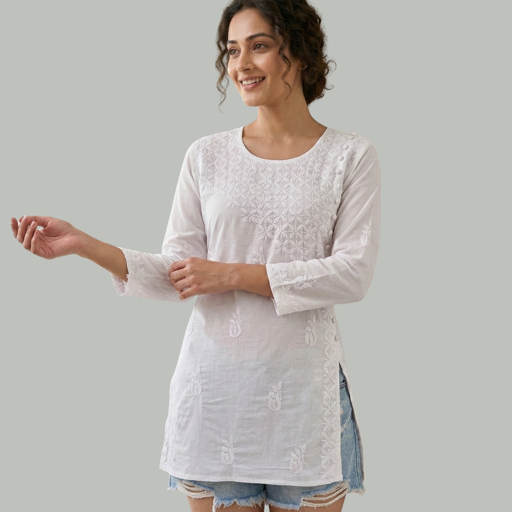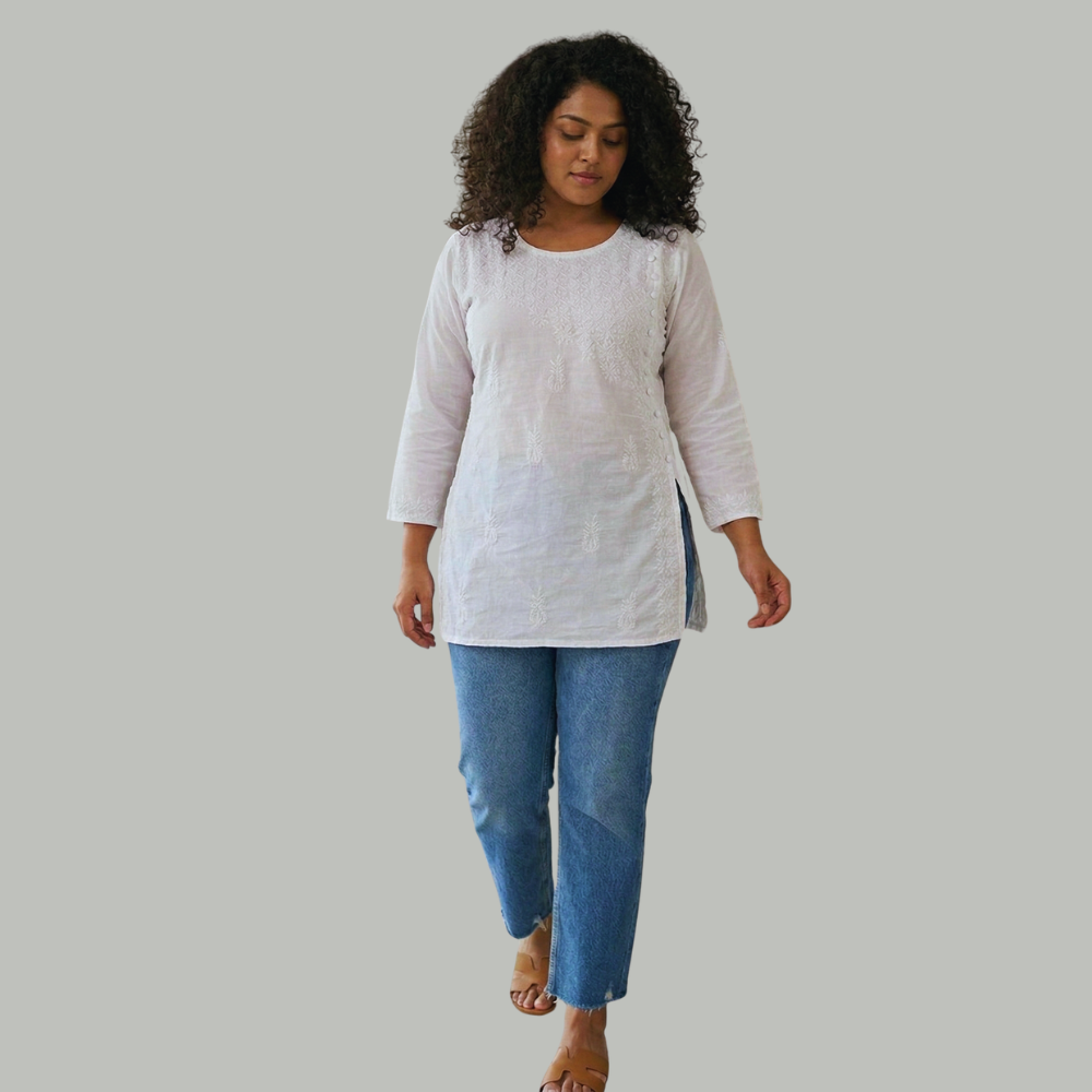 Adorned with subtle Chikankari-inspired embroidery, the kurti features delicate motifs across the front and along the side panel, adding texture while maintaining a clean and minimal aesthetic. The short length with side slits and three-quarter sleeves creates a relaxed silhouette that pairs beautifully with both ethnic and contemporary bottoms.