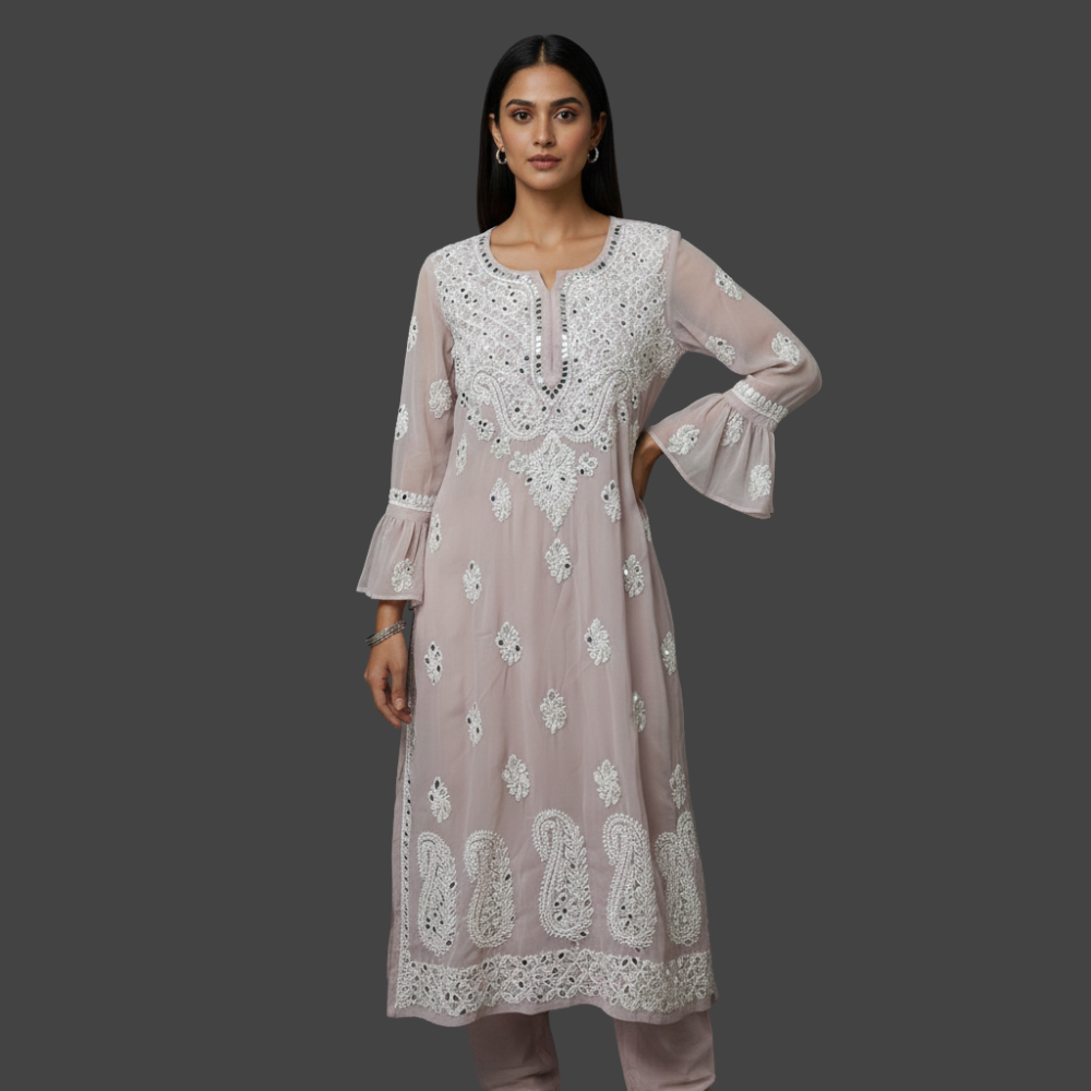 Georgette Chikankari Kurti embellished with mirror work, featuring intricate embroidery that adds a festive sparkle and a graceful flow to the silhouette.