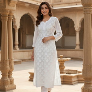 A graceful white georgette Chikankari straight kurta featuring delicate hand embroidery, offering a lightweight and elegant look perfect for both everyday sophistication and festive occasions.