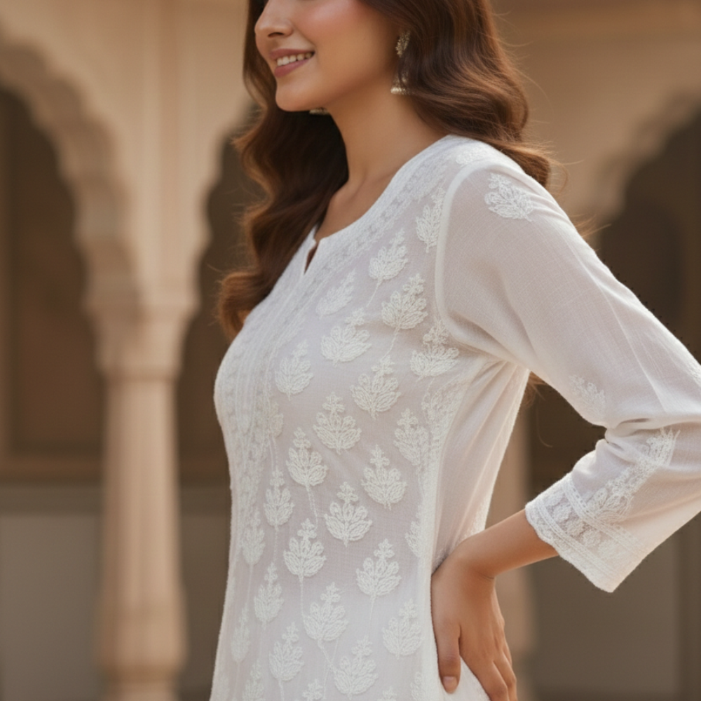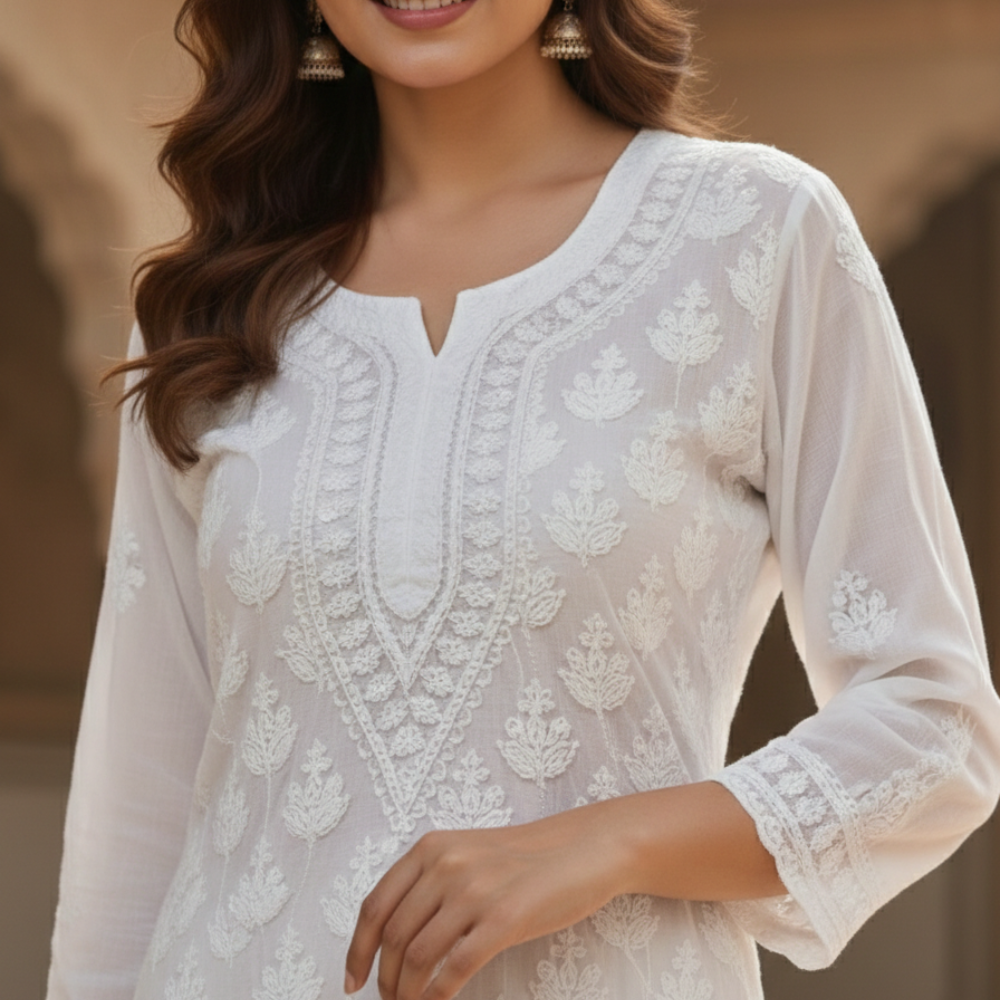 Timeless and effortlessly elegant, this white Chikankari kurta crafted in soft georgette fabric beautifully showcases the heritage artistry of Lucknow. The kurta is adorned with intricate hand-embroidered Chikankari motifs that create a delicate texture and refined visual appeal.